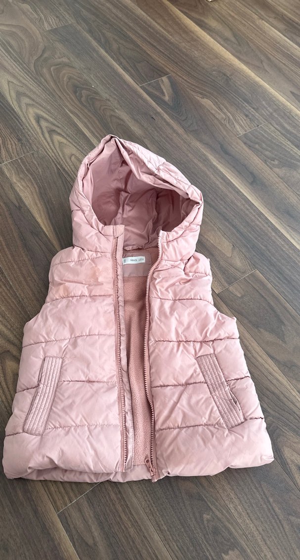 Kız çocukları için kapüşonlu, pastel pembe renkli, sıcak ve yumuşak kumaştan yapılmış dar kesim yelek.