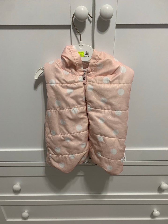 Kız çocukları için kapüşonlu, düğmeli, pastel pembe batik desenli, yumuşak ve sıcak kumaştan yapılmış, dar kesim kolsuz yelek.