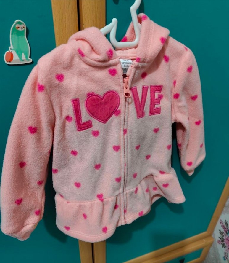 Rahat kesim kız çocuk ceketi, kapüşonlu ve fermuarlıdır. Yumuşak ve sıcak kumaştan yapılmış, renkli kalp desenleri ve önünde 'LOVE' yazısı vardır.