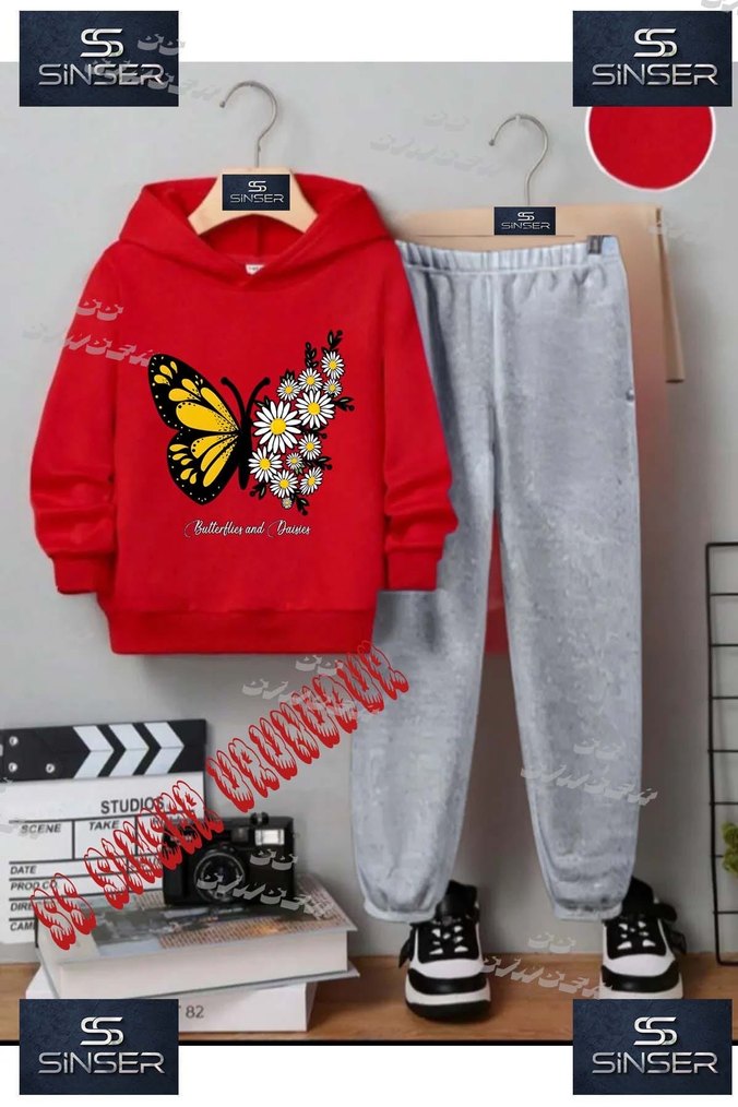 Kız çocuk kapüşonlu üstü renkli kelebek ve çiçek baskılı, altı gri bol kesim eşofman takımı. Yumuşak ve sıcak fleece kumaştan, rahat ve şık. Örgü detaylıdır.