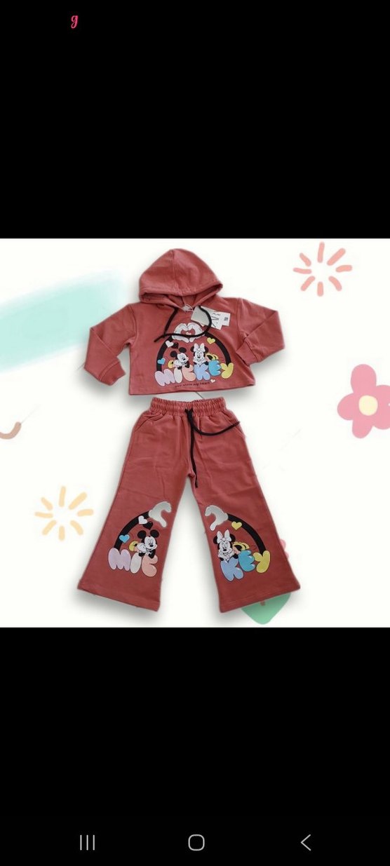 Rahat kesim kız çocuk kapüşonlu uzun kollu üst ve geniş paça pantolon, renkli Mickey ve Minnie baskılarıyla. Rahat ve şık günlük giyim için ideal.3-4 yaş uyumludur