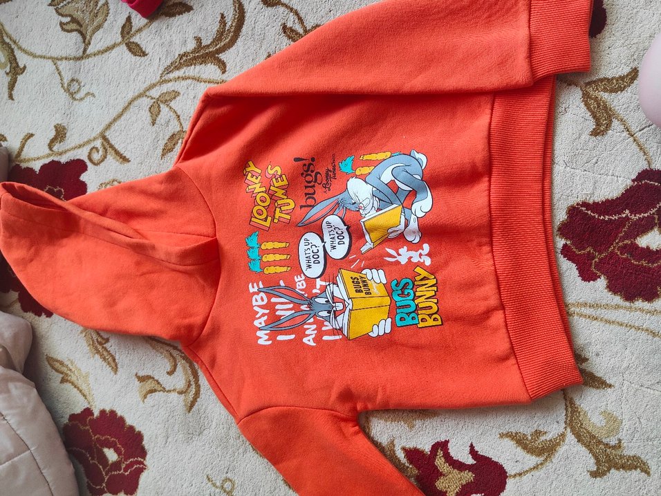 Renkli, uzun kollu ve kapüşonlu kız çocuk sweatshirtü. Yumuşak kürk dokulu, örme malzemeden ve Bugs Bunny baskılıdır. Rahat kesimle sokak stiline uygun. mavi sweatshirt orijinal sıfır kullanılmamış 5/6 yaş