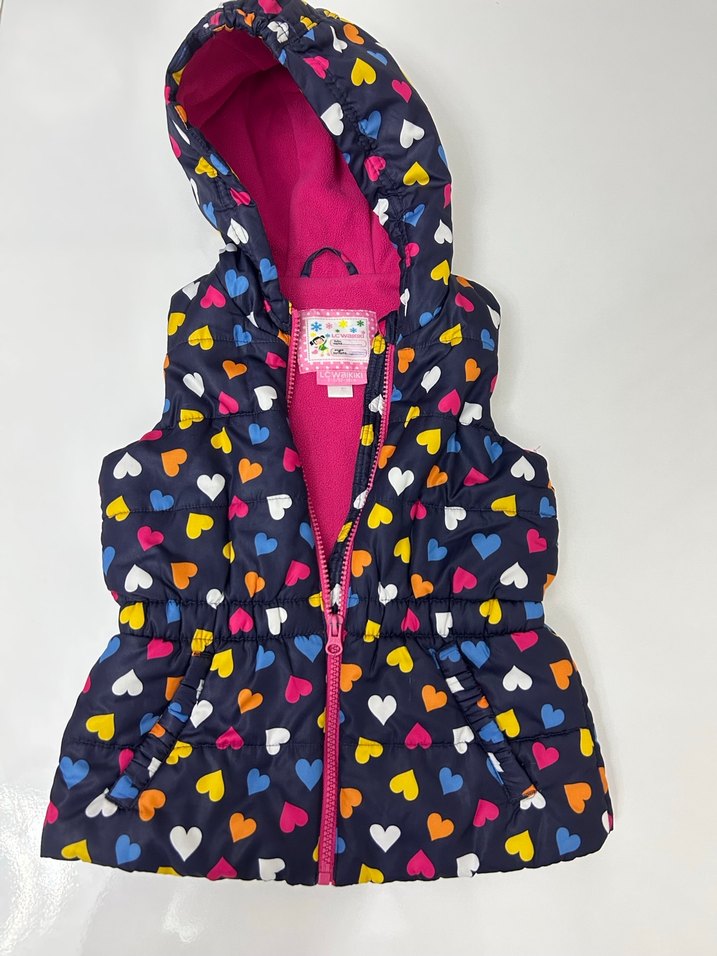 Kız çocukları için kapüşonlu, fermuarlı ve renkli kalp desenli, yumuşak ve sıcak dokulu fitted yelek. Trendy günlük tarz için uygundur. 2-3 yaş arasına uygundur.