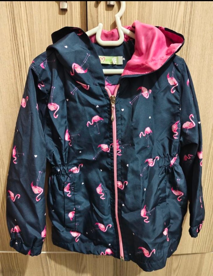 Kapüşonlu, fermuarlı kız çocuk rüzgarlık mont. Canlı pembe flamingo desenli, renkli ve şık bir tasarıma sahip.