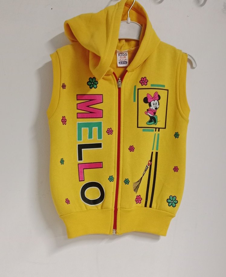 Kız çocukları için kapüşonlu, önü fermuarlı, sarı renkli, baskılı ve renkli pop kültür desenli, yumuşak ve sıcak kumaştan yapılmış fitted yelek. İçi şardonlu