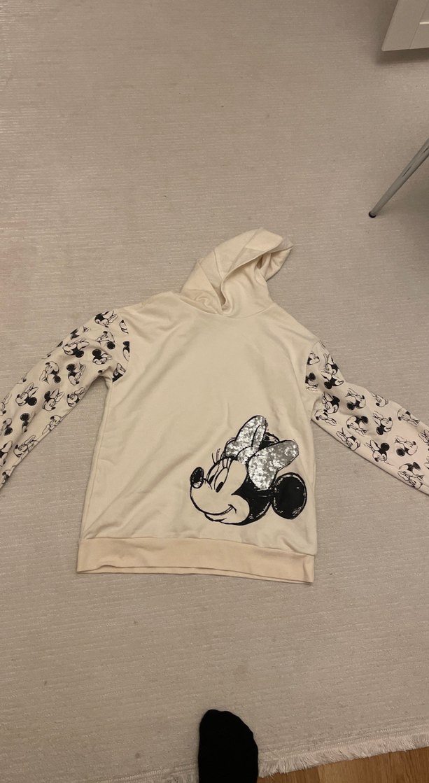 Gevşek kesim kız çocuk kapüşonlu sweatshirt, uzun kollarda Minnie Mouse baskılıdır. Beyaz ve gri tonlarda yumuşak örme kumaştan üretilmiştir.