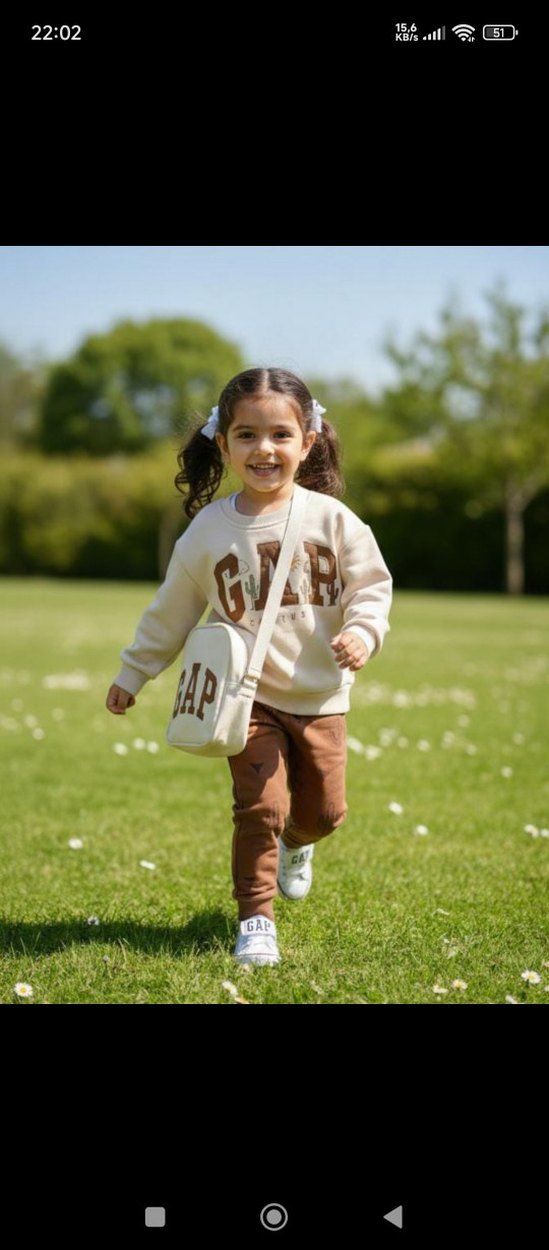 Hafif kahverengi renkli, kapüşonlu sweatshirt ve baskılı, kabarık kollu eşofman altı ile bol kesim rahat bir set. 2/3 yaş
