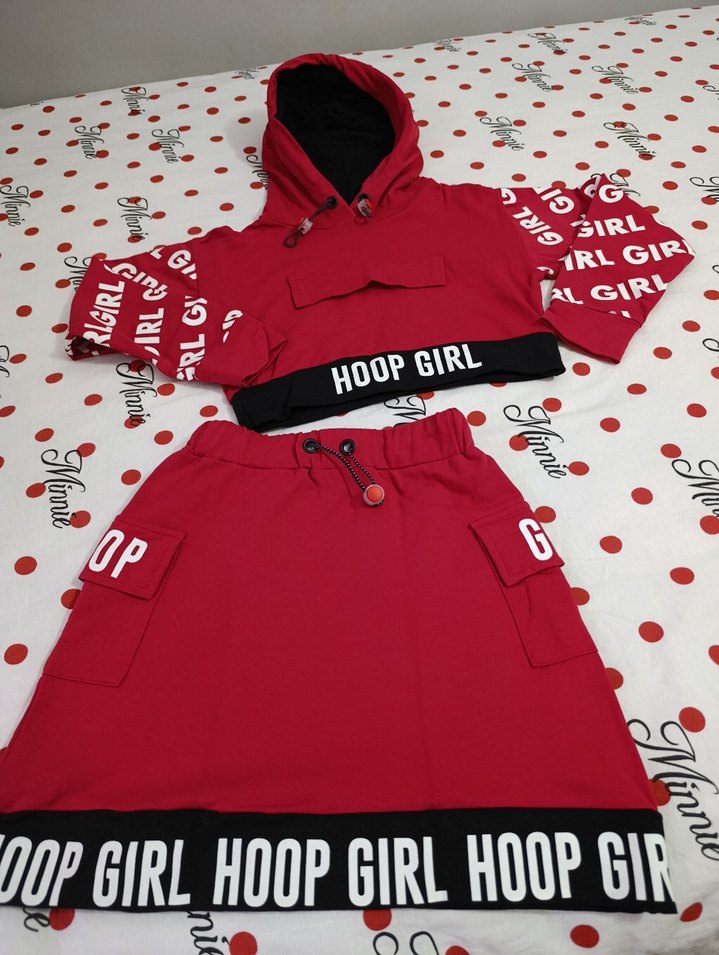 Kız çocukları için kırmızı renkli, kapüşonlu, uzun kollu ve bol kesim sweatshirt ile cırt cırtlı cepleri olan etek takımı. Sweatshirt ve etek üzerinde 'HOOP GIRL' yazılı bantlar bulunur. sadece bir kez giyildi 7/8 yaş uyumlu çok tarz spor takım
