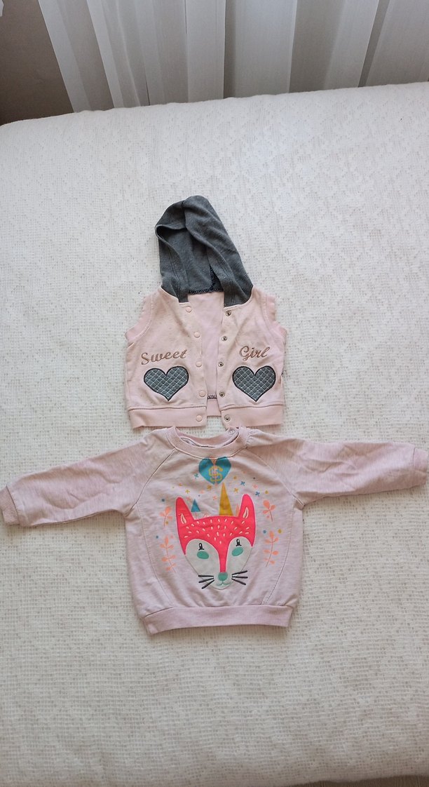Kız çocuk için kapüşonlu, uzun kollu sweatshirt ve örgü yelek seti. Pastel pembe renkte, baskılı tilki ve kalp detaylıdır.