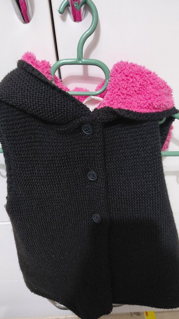 Kapüşonlu, kolsuz, triko yelek. Siyah dış yüzey ve canlı pembe iç astar. Fitted kesim, goth tarzıyla şık bir kombin.