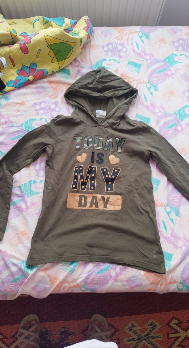 Kız çocukları için kapüşonlu, uzun kollu ve bol kesim sweatshirt. Önü 'TODAY IS MY DAY' yazılı baskılıdır. Yumuşak ve sıcak örme kumaştan yapılmıştır.