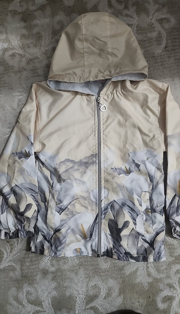 Kız çocuk kapüşonlu, bol kesim, bej ve gri tonlarında batik desenli sentetik kumaştan yapılmış çiçek detaylı yağmurluk.Kolları lastikli Sokak modasına uygun. Defo yok. 6 yaş