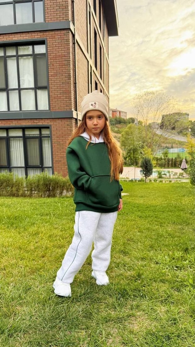 Yeşil kapüşonlu bol kesim sweatshirt ve gri eşofman, yumuşak ve sıcak kumaştan, rahat sokak stili için uygundur. GARSON 5-6/ 7-8/ 11-12 OVERSİZE ✏️3 İP ŞARDONLU 3 rope raised