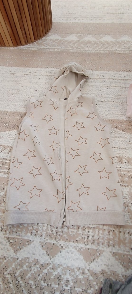 Kız çocukları için kapüşonlu, fermuarlı ve yıldız işlemeli bej renk yelek. Rahat ve bol kesim, günlük sokak stiline uygun.