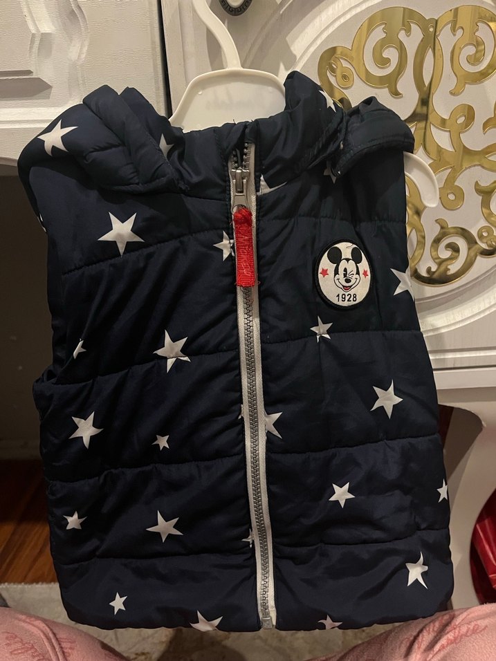 Kız çocukları için fermuarlı, yıldız desenli ve kapüşonlu yelek. Notch yakalı, sıcak ve rahat kumaştan üretilmiştir. Mickey Mouse armalı.