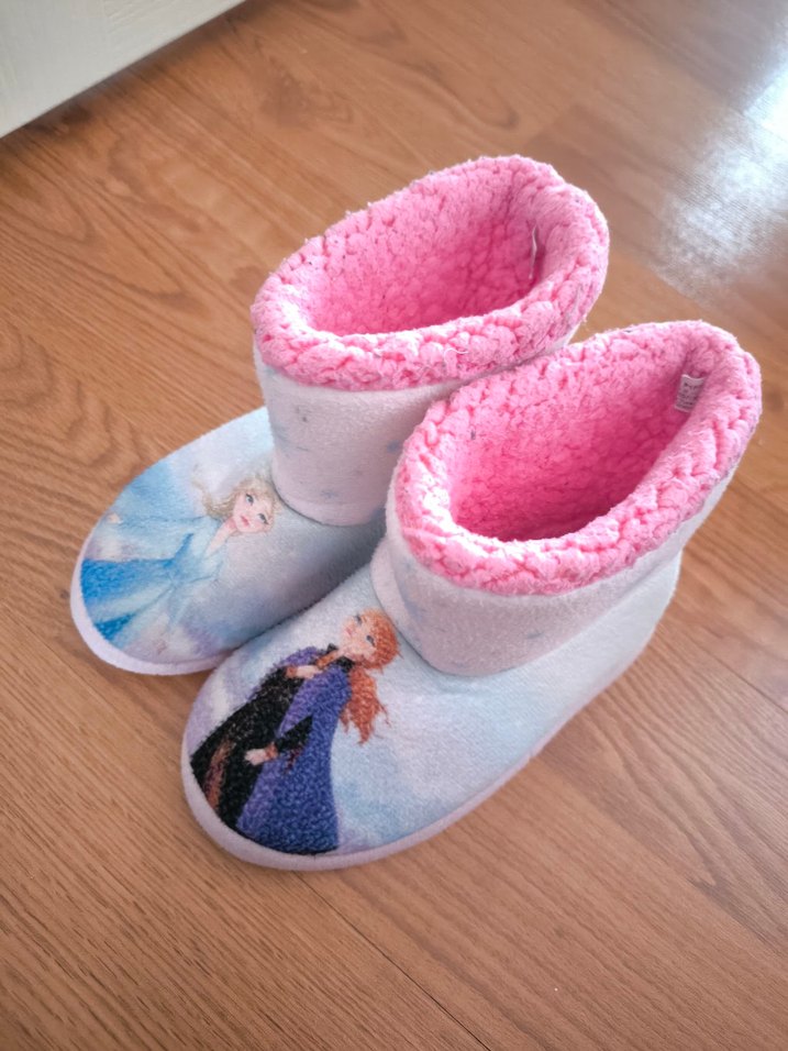 Yumuşak, tüylü iç yapıya sahip, örgü kız çocuk ev botu. Pastel renkli baskılı pop kültür karakterleriyle beyaz ve sıcak. 30-31 numara. temiz ürün