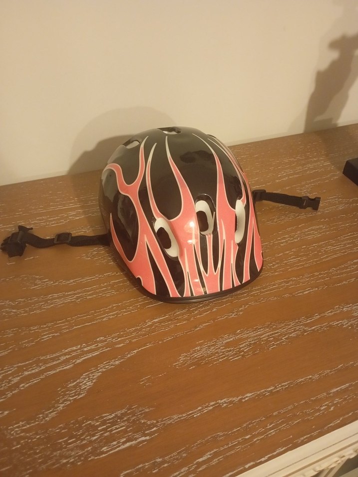 Kayışlı, koyu taban üzerinde pembe alev desenli motosiklet kaskı. Kauçuk malzemeden, grunge punk tarzında rock punk havası verir. ️