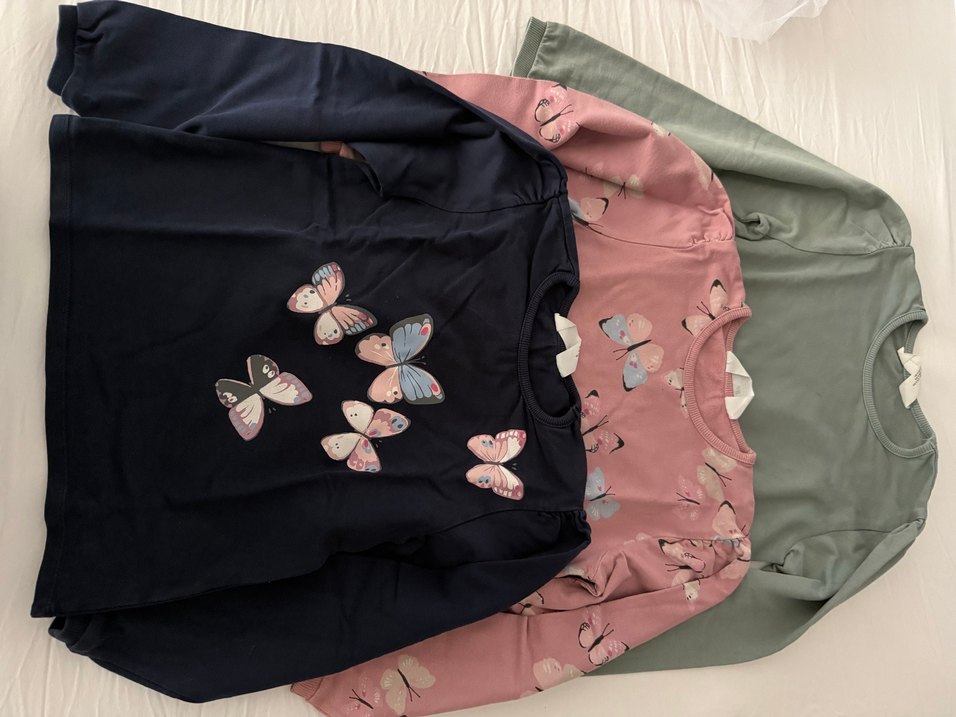 Koyu renkli, sentetik kumaştan yapılmış, kelebek baskılı, düğmeli, uzun kollu, dar kesim kız çocuk tişörtü. 6-8 yaş