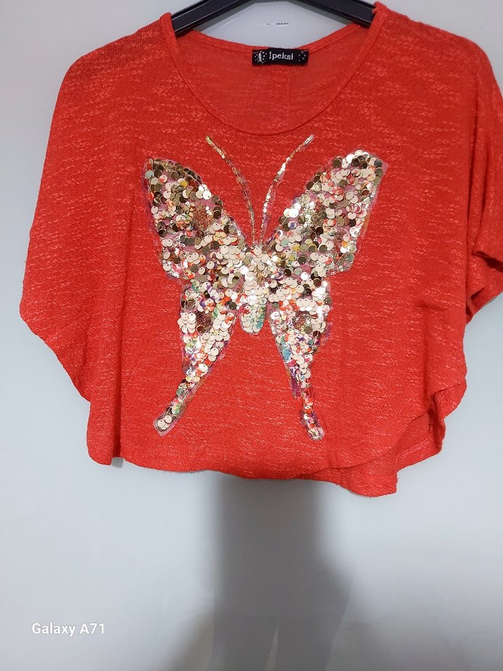 Kelebek desenli simli, kırmızı renkli, kısa kollu, bol kesim kız çocuk tişörtü. Bohem ve retro tarz için uygun.