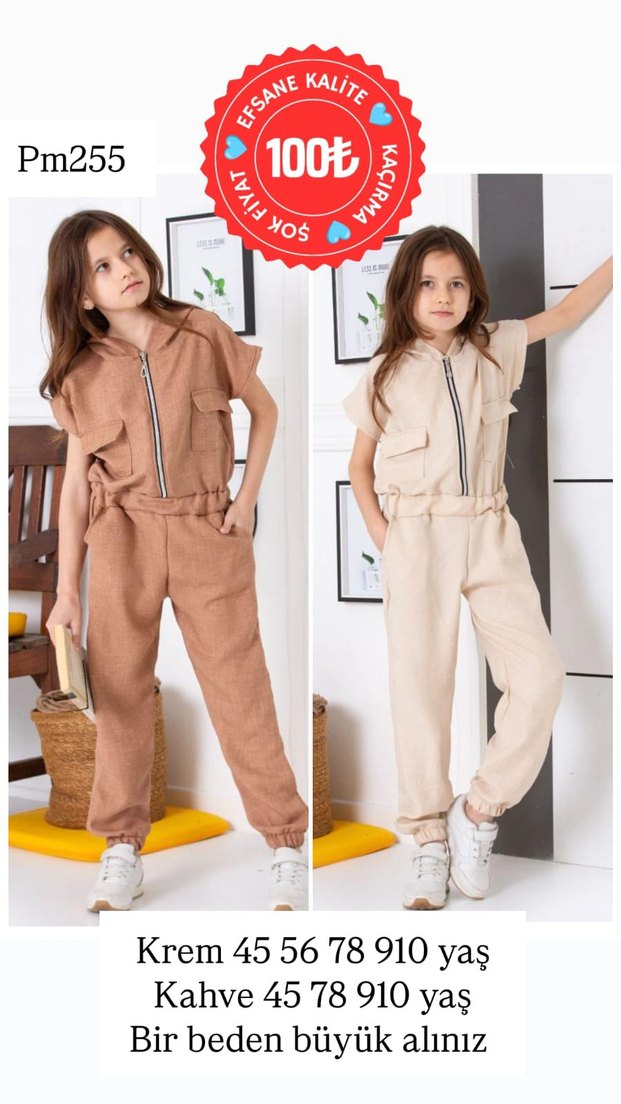 Kız çocukları için keten kumaştan, kemerli, straplez yakalı ve kısa kollu rahat tulum. Açık kahverengi ve krem renk seçenekleriyle.