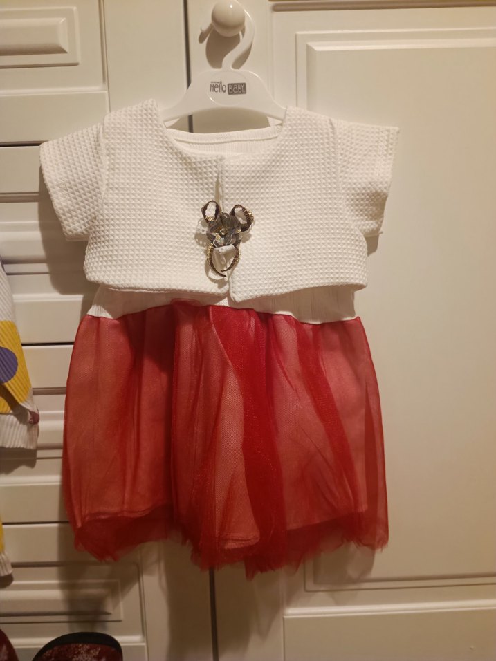 Kemerli, kısa kollu, bisiklet yaka ve baskılı desenli kız çocuk elbisesi. Beyaz dokulu üst ve canlı kırmızı etekle sokak modası tarzında.
