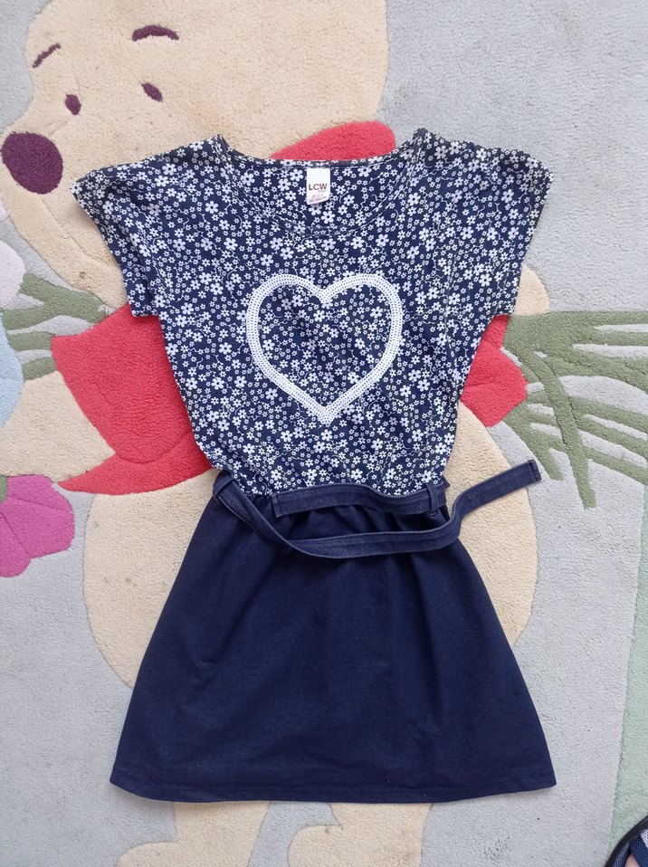 Kemerli, kısa kollu, bisiklet yaka mavi renkli, çiçekli baskılı, kız çocuk elbisesi. bir sorunu yok