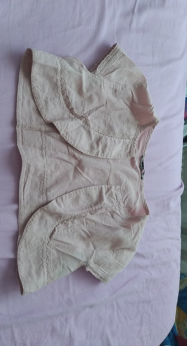 Keten kumaştan yapılmış bej renk kız çocuk bolero, bol kesimdir. Yaka kısmı kesik yakalı ve düğmeli ön detayına sahiptir. Kolsuz tasarımıyla rahatlık sağlar.