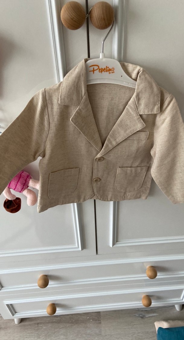 Bej renkli kız çocuk keten ceket düğmeli ve notched lapel yaka detayına sahiptir. Uzun kollu ve rahat kesimlidir. Sade, bohem tarzıyla dikkat çeker.