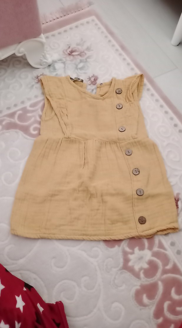 Kız çocukları için keten kumaştan, bej renkli, düğmeli ve salaş kesim elbise. Kayık yaka ve bohem tarzda, sade tasarım.