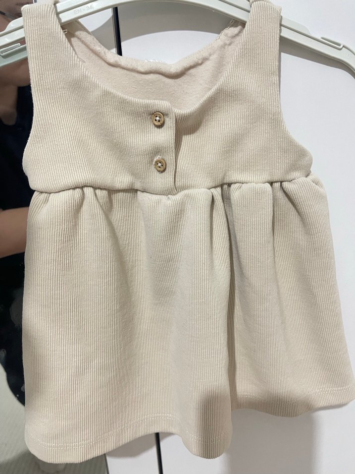 Kız çocuk keten kumaştan, kolsuz ve düğmeli önden detaylı, bol kesim bej elbise. Sade ve normcore stilde günlük kullanıma uygun.