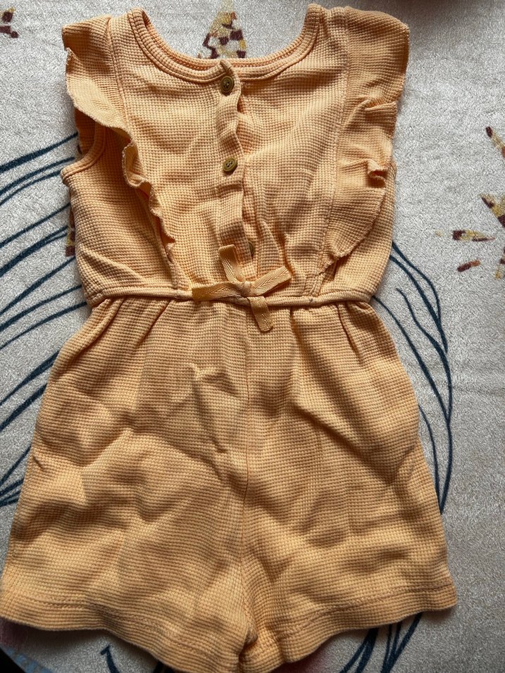 Bej renkli, keten kumaştan yapılmış, kolsuz ve bol kesim kız çocuk tulumu. Önü düğmeli ve belden bağlamalı, fırfır detayları bulunur.
