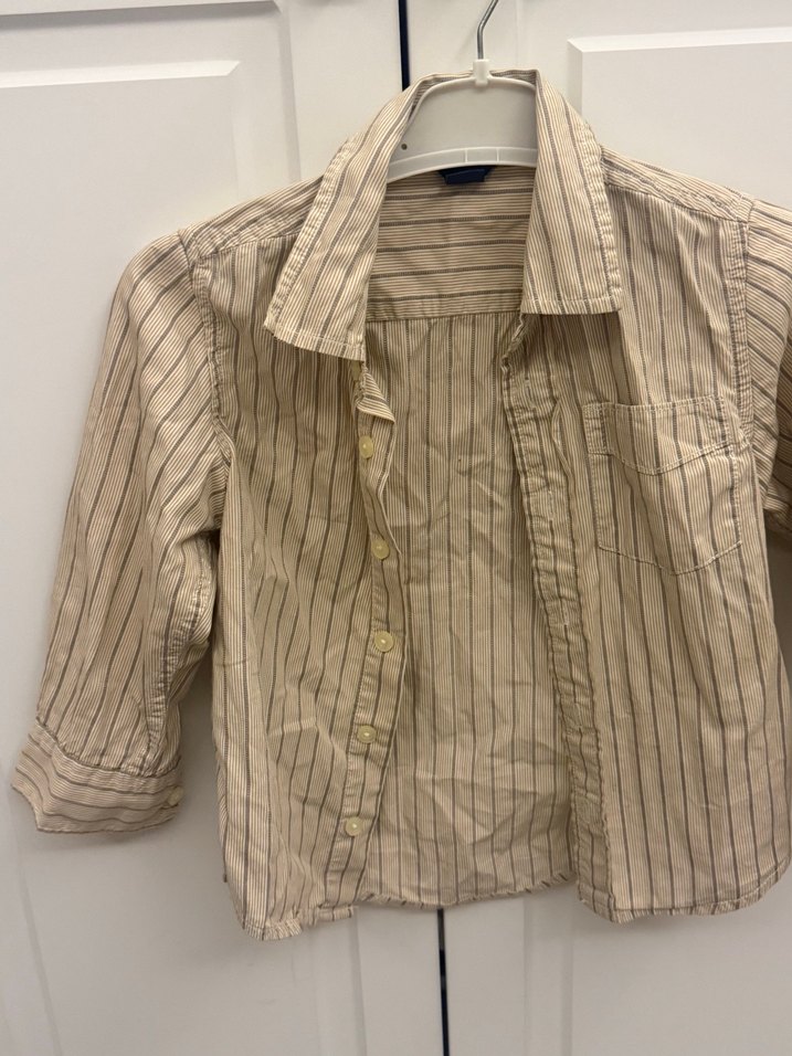 Kız çocuk keten bej gömlek, düğmeli, kısa kollu ve çentikli yakalıdır. Rahat kesimli ve ince çizgili, günlük sokak tarzı için uygundur.