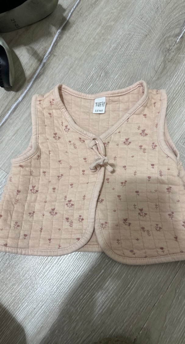 Keten kumaştan, düğmeli ve straplez yakalı kız çocuk yeleği. Bohem tarzda, bej renkte ve çiçek desenli, fitted kesim.