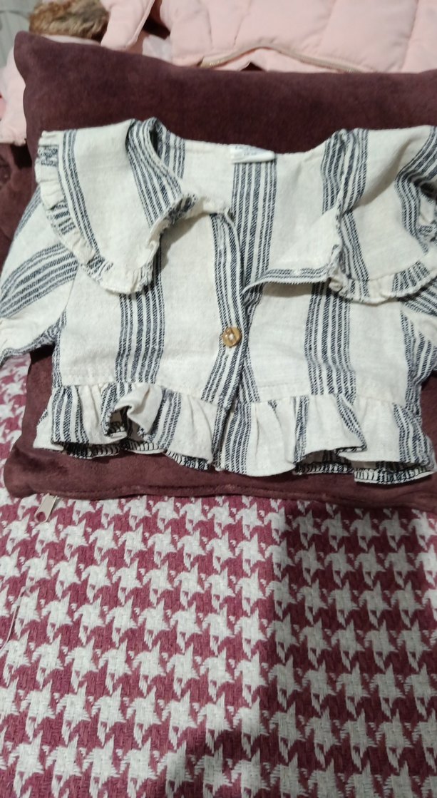 Yumuşak keten kumaştan, bol kesim kız çocuk gömleği. Uzun kollu, yakalı ve fırfır detaylı, gri beyaz çizgili desenli.