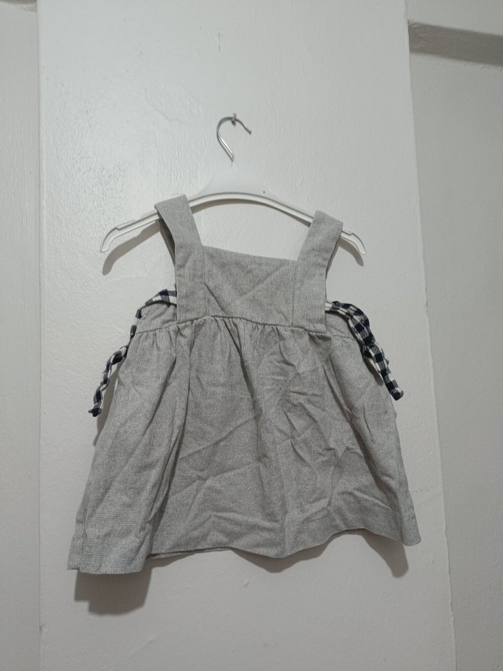 Gri renkli, keten kumaştan yapılmış, askılı ve fırfırlı detaylara sahip bol kesim kız çocuk elbisesi.
