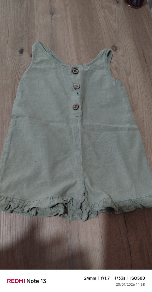 Kız Çocuk Keten Gri Düğmeli Tulum haki renk