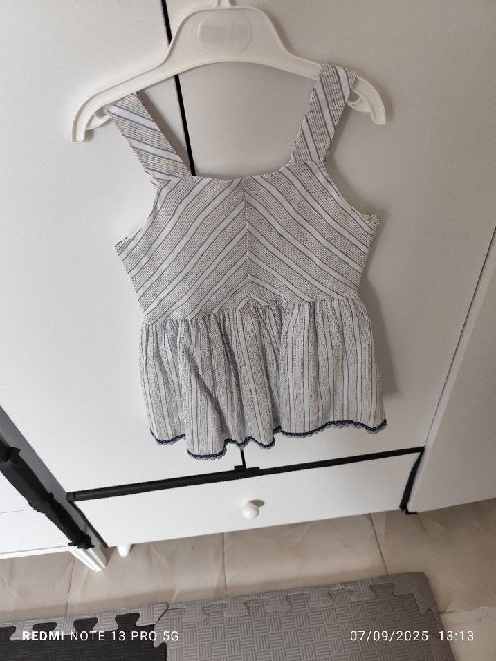 Kolsuz, keten kumaştan gri kız çocuk elbisesi. V yaka ve fırfır detaylı, bol kesim ve bohem tarzda, trend bir günlük görünüm sağlar. B&C marka. yeni etiketli 3-6-9 ay kullanımına uygun