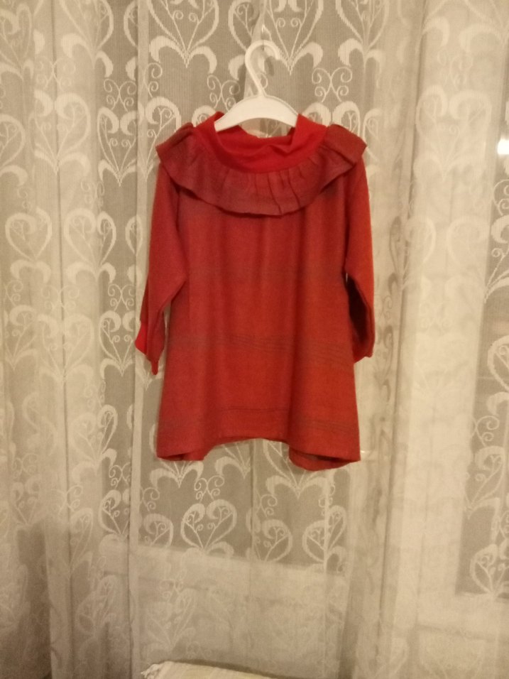 Kız çocuk keten kumaştan, uzun kollu ve yüksek yakalı kırmızı elbise Fırfır detayı ve bol kesimiyle rahat bir tasarım sunar.