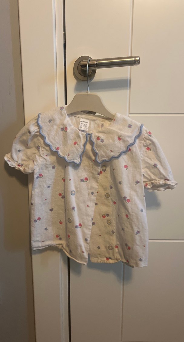 Kız çocuk keten kısa kollu, düğmeli, bol kesim vintage tarzda beyaz üzerine pastel çiçek desenli gömlek.