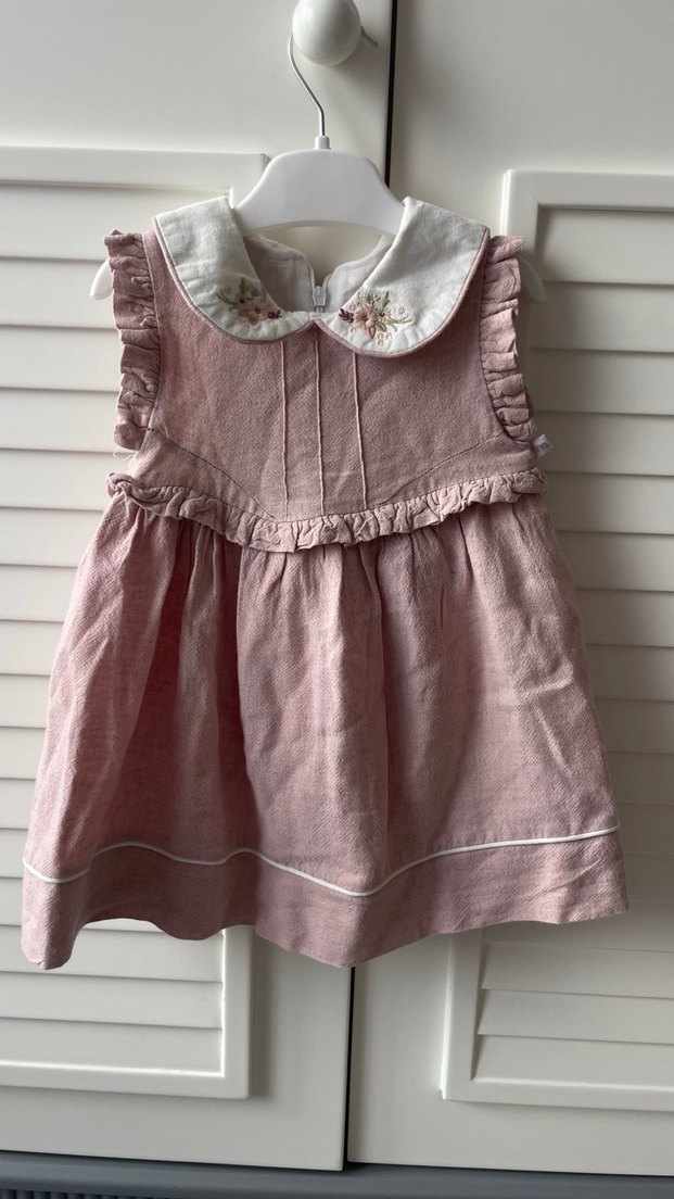 Kız çocuk elbise Vintage tarzda, keten kumaştan yapılmış pembe renkli, fırfırlı ve bebe yakası nakışlı, kolsuz. 1.5 yaş bir kaç kere giyildi.