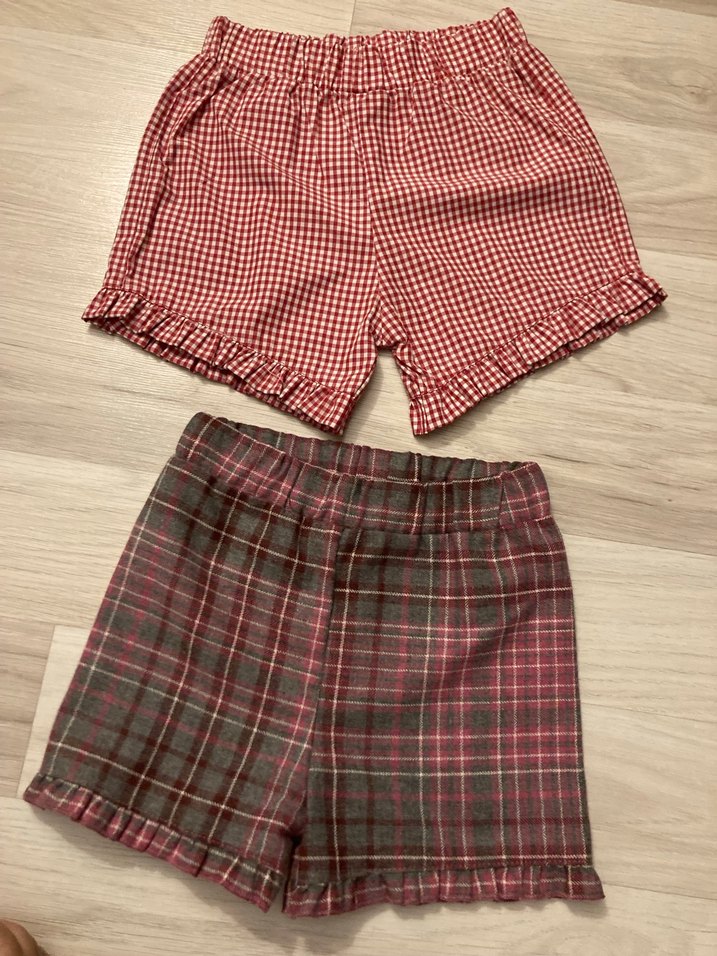 Biri 9 ay -74cm için ,diğeri 1yaş ile 2yaş 93 cm ikisi de hiç giyilmedi.Yumuşak pamuklu kumaştan, bol kesim kız çocuk şortları, etek ucunda fırfır detayıyla. Koyu kırmızı kareli ve ekose desen seçenekleriyle. Rahat ve sade tarzda.