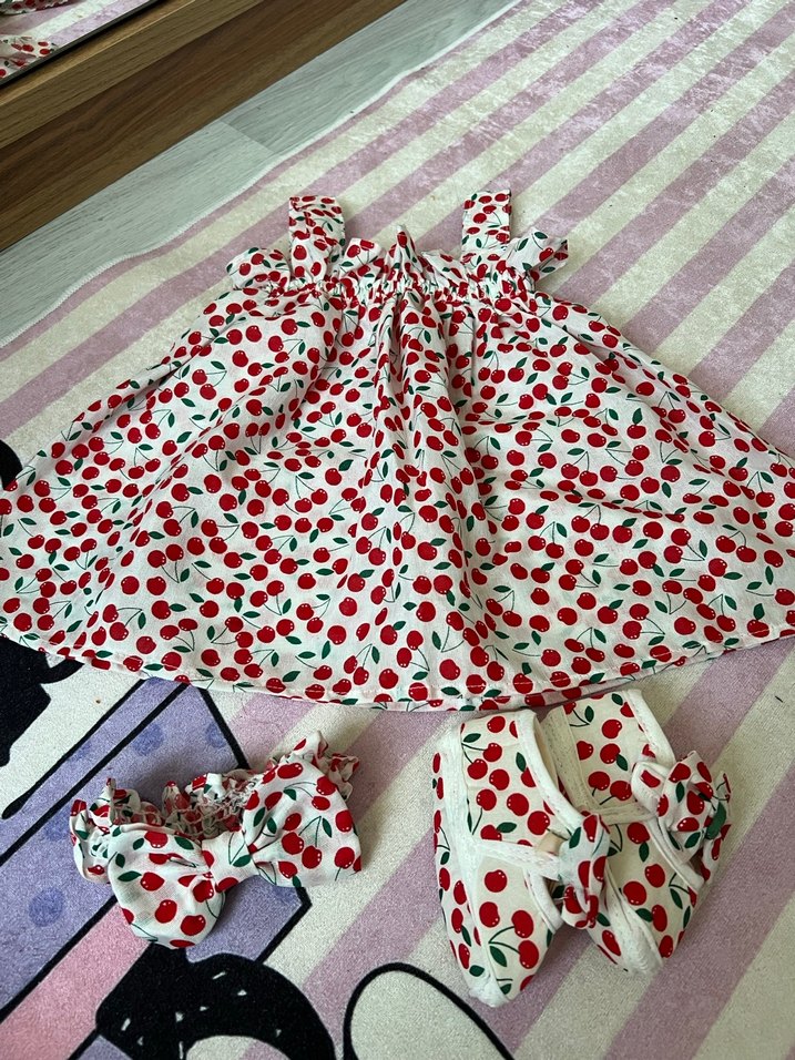 Renkli kiraz desenli, askılı ve fırfırlı kız çocuk elbisesi. Beyaz kumaştan üretilmiştir. Aynı desende saç bandı ve ayakkabı ile tamamlanır.