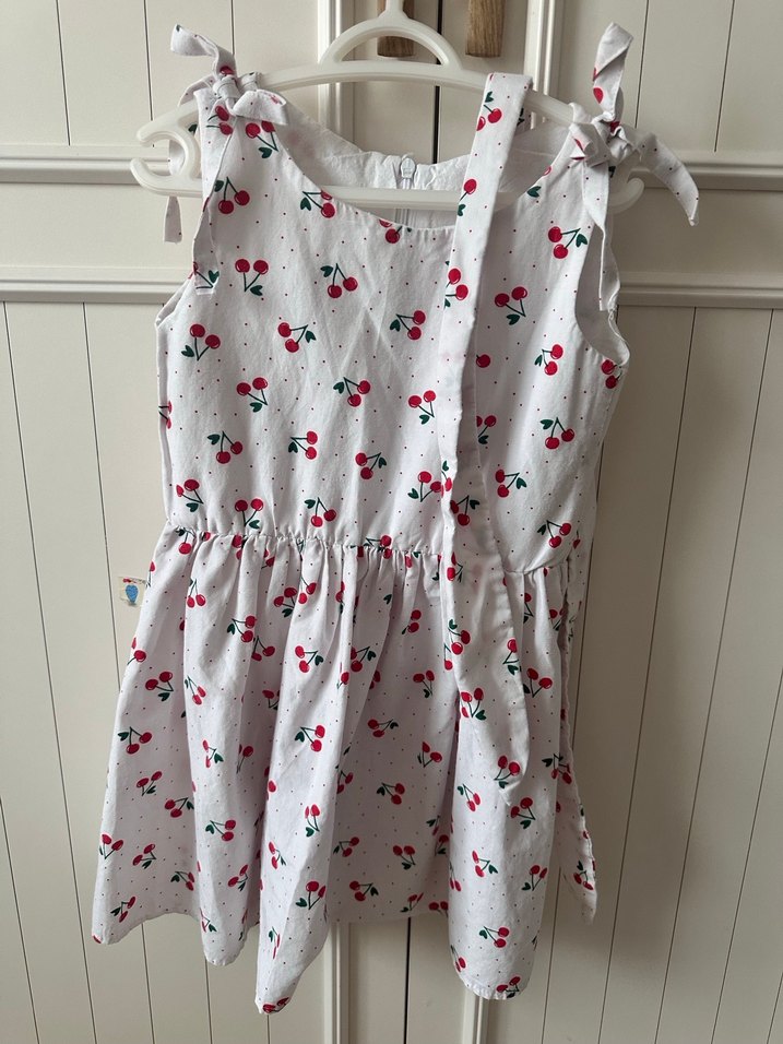 Dolabımdaki çocuk ürünlerinin hepsini toplu almak isteyen olursa 2000 liraya vereceğim. Pamuklu, kiraz desenli, fırfırlı ve askılı kız çocuk elbisesi. Salaş kesimi ve straplez yakası vardır.