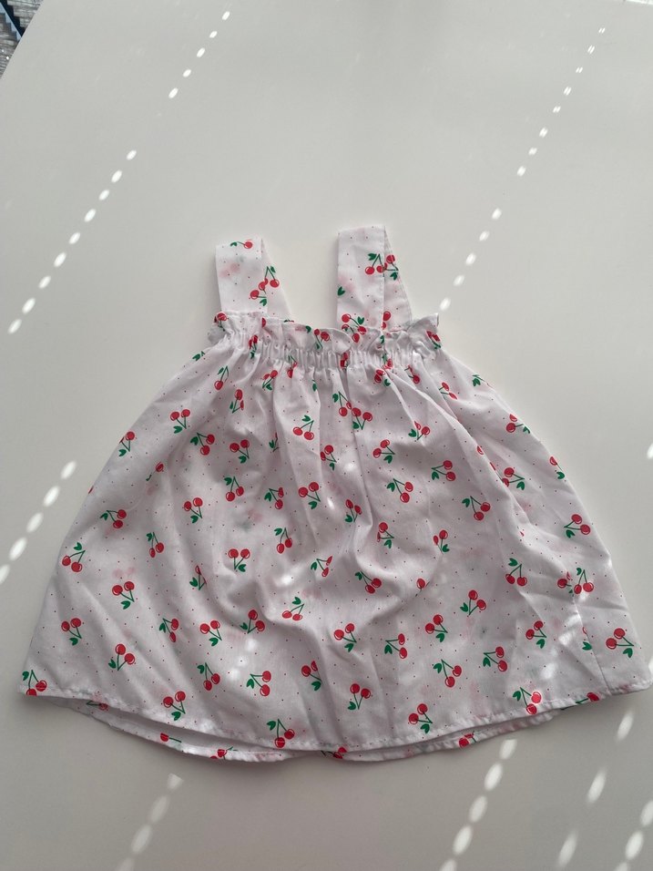 Pamuklu, kolsuz, renkli kiraz desenli, straplez, bol kesim kız çocuk elbisesi. Fırfır detaylarıyla sokak stiline uygun.