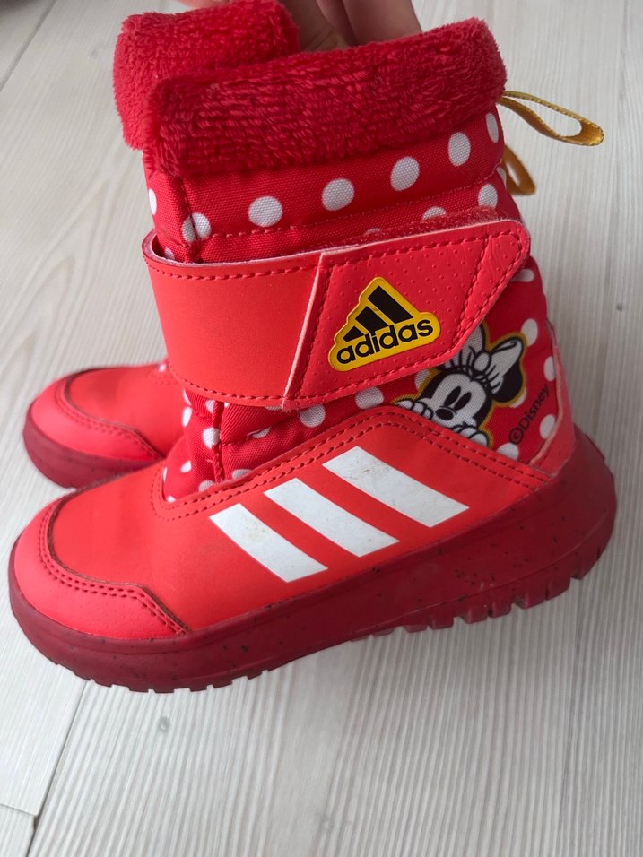Kız çocuklar için kırmızı Adidas botlar, cırt cırtlı bantlar ve renkli baskılı tasarıma sahip, lastik tabanlı sokak stili için uygundur. Çok temiz ve az giyildi