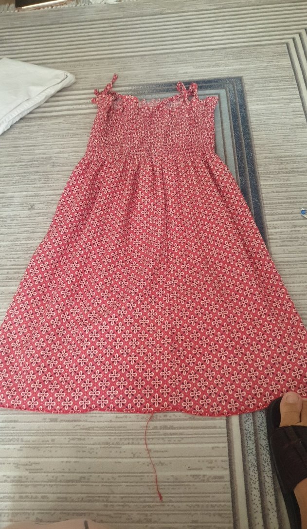 Kız çocuk elbisesi, askısız yaka ve pileli detaylara sahip. Yumuşak sentetik kumaştan, renkli kırmızı batik desenli ve bol kesimdir.