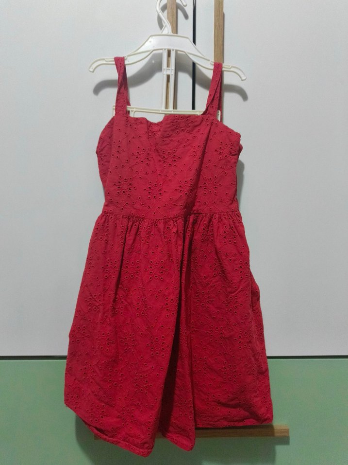 Kız çocuklar için kırmızı, askılı, vücuda oturan elbise. Yumuşak sentetik kumaştan, fırfır detaylı ve bohem tarzda.