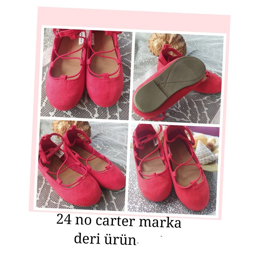Kız çocuklar için kırmızı babetler, elastik detaylı ve kauçuk tabanlıdır. Deri malzemeden yapılmış, renkli ve sade bir görünüme sahiptir. 24 no Carter marka.
