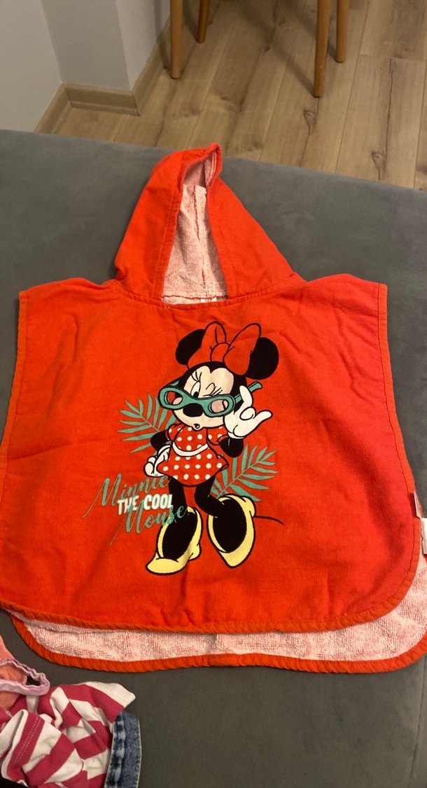 Renkli kırmızı panço, bol kesim, straplez yaka ve kolsuz tasarıma sahiptir. Yumuşak kumaştan üretilmiş, fermuarlı ve Minnie Mouse baskılıdır.