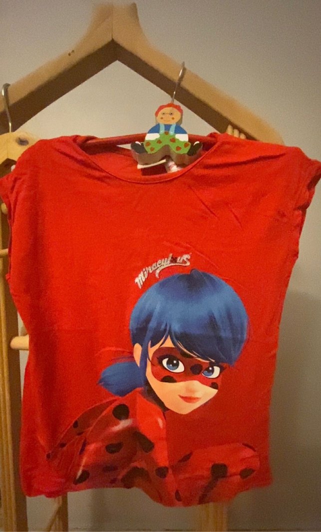 Kırmızı renkli, baskılı ve dar kesim kız çocuk tişörtü. Yuvarlak yaka, kısa kollu ve tokalı detaylı, sentetik kumaştan üretilmiştir.